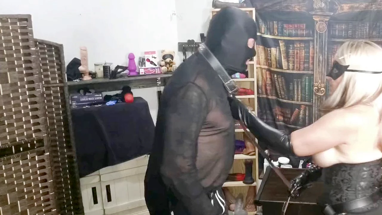Die Domina trifft den Hintern ihres subs und lässt ihn in seiner winzigen Zelle explodieren